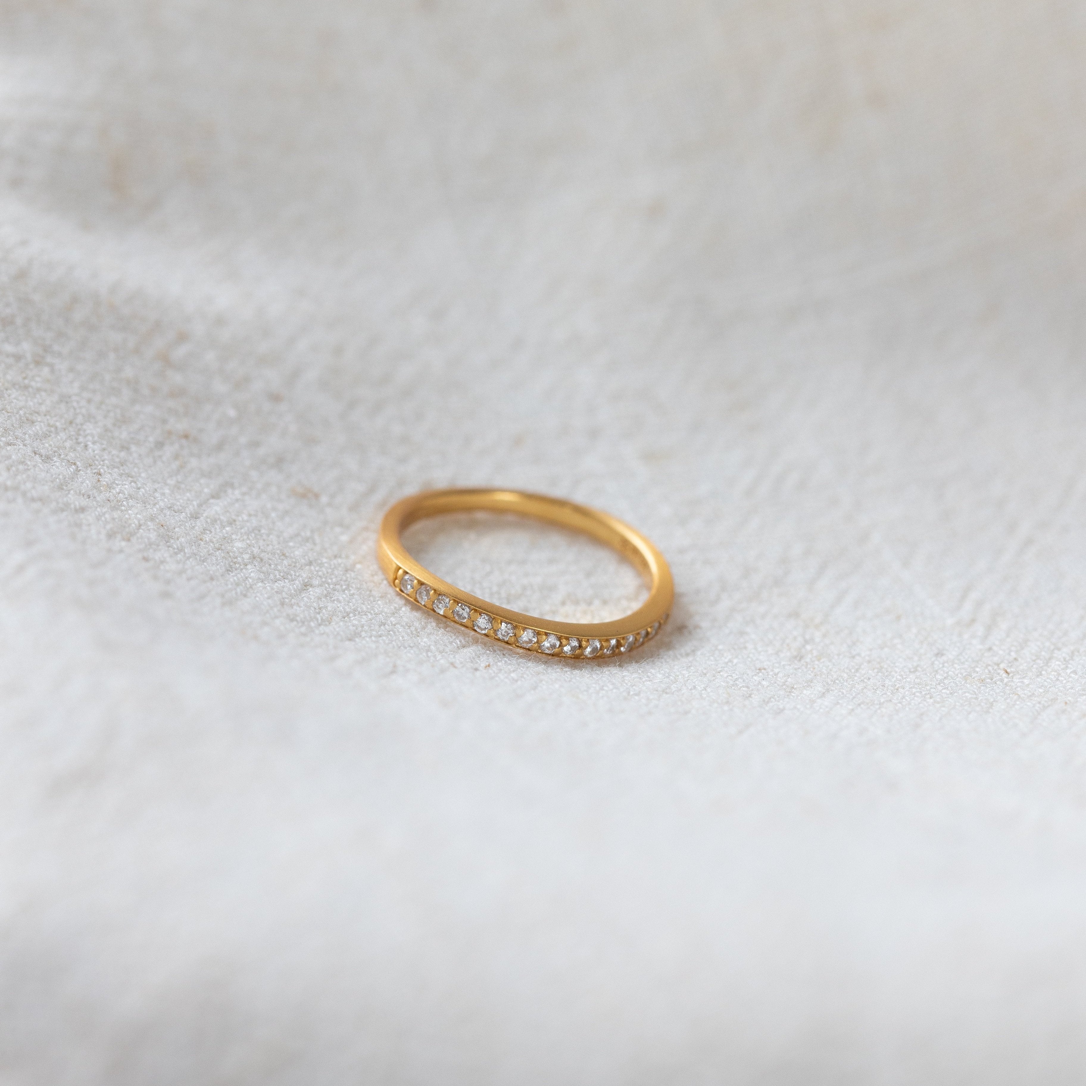 Ein schöner und schlichter Ring! Der Ring besteht aus 14 Karat vergoldetem Sterlingsilber und ist mit weißem Zirkonia versehen. Sparkle-Bänder sind sowohl an sich schön als auch der perfekte Ring zum Stapeln.