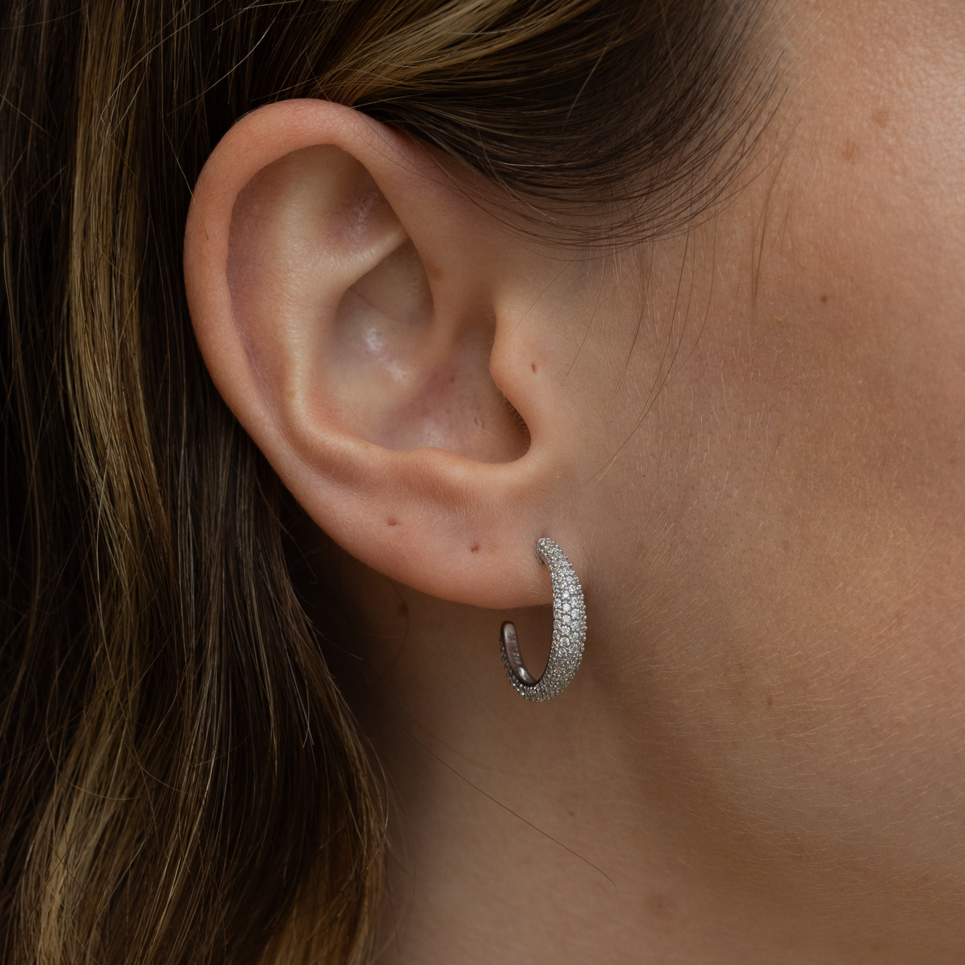 Our Ocean Flow Hoops – now with sparkle! Perfect for both everyday and festive occasions. Ocean Flow Sparkle Hoops are made of recycled sterling silver and decorated with white zirconia. The shape of the earring moves from narrow to wide, giving a unique look compared to traditional hoops.