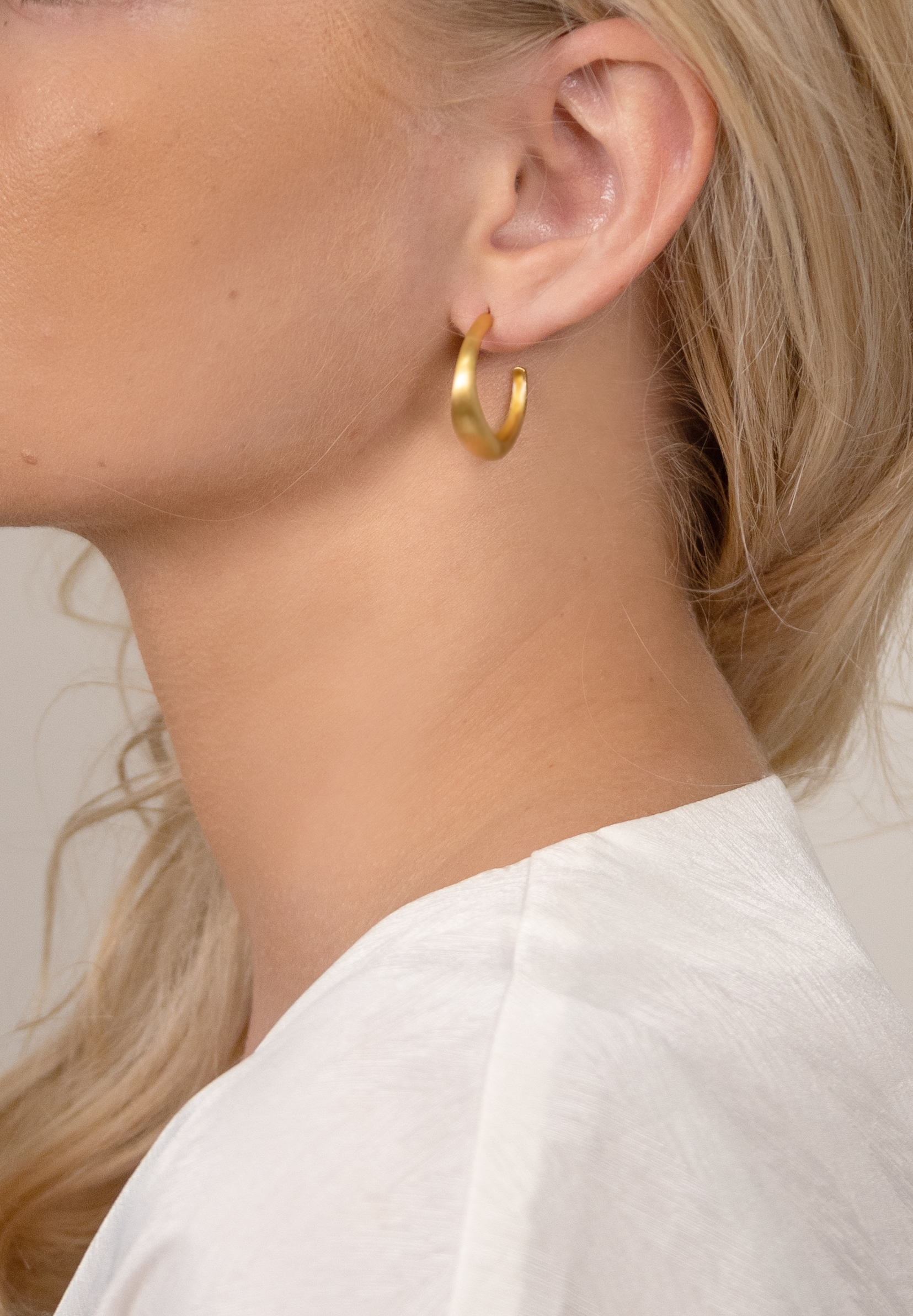Øreringene er en nyfortolkning af de originale hoops, men fremstillet i en semi-polished overflade, som giver et mere iøjnefaldende udtryk. Overfladen matcher byBiehl Essentials.